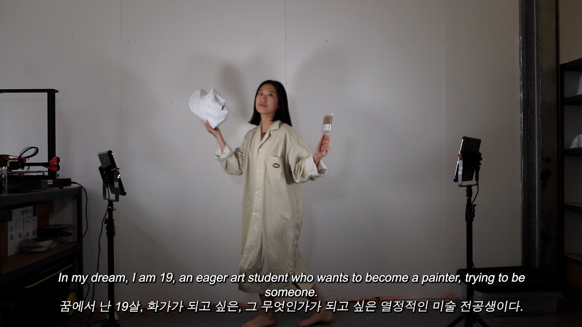 《썩어빠진 사랑》은 예술 세계가 불완전하고 부서지기 쉬운 사랑 위에 구축되어 있다는 생각에서 출발한다. 젊은 여성 작가의 시선을 통해 유쾌하게 펼쳐지는 이 영상은, 미술계의 겉보기 화려함에 매혹된 주인공이 예술 생태에 대해 아무것도 모른 채 작가를 꿈꾸는 과정과, 결국 남자도 예술도 사랑하지 않게 되는 순간까지를 따라간다. “전문가”와 “아마추어”를 가르는 기준은 무엇일까? 이 질문은 예술가라는 존재가 처한 감정적 불안정성과, 예술계의 모순된 욕망 구조를 은근히 드러낸다.